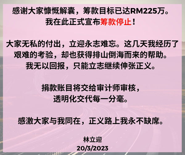 林立迎今午在面子书贴文指出,截至今早11时25分,他所委托的律师楼信托银行户头,已筹获225万令吉,因此他宣布停止筹款。