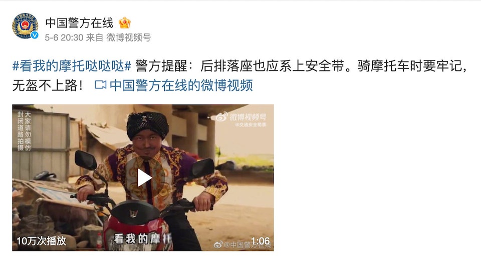 据报道,中国公安部上周六(6日)在官方帐号“中国警方在线”,上传了一段该国网红“豪哥哥”的搞笑影片“看我的摩托哒哒哒”,称“警方提醒,后排落座也应系上安全带。骑摩托车时要牢记,无盔(安全帽)不上路!”以宣传道路安全规则,相关影片在Youtube中亦有人转载。