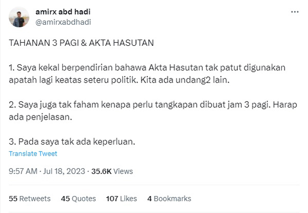 阿米尔也质问当局为何要在凌晨3时逮捕沙努西,并希望警方可以解释。