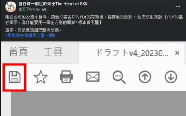 FB粉专“盘谷唯一劝世吵架王The Heart of BKK”周二指出,自己请一名刚进公司的22岁鲜肉同事,打开海外客户的PDF另存新档,并在翻译后回传给他,未料同事却向他说:“PDF的储存图示,为什么要用一个正方形的图案?根本看不懂”,然而,该图示就是过去从DOS时代一直是主流的磁碟片,这让他突然意识到这个世代差距,“发现自己眼角泛泪”。