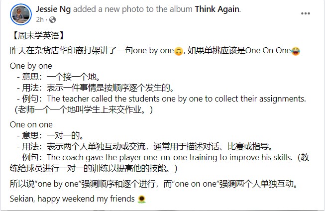华裔店主在杂货店打趴滋事者一事在网络爆火后,TEDx茨厂街(TEDx Petaling Street)策展人黄菁翠趁机在面子书教英语,指出双方在“开打”前的语法错误。