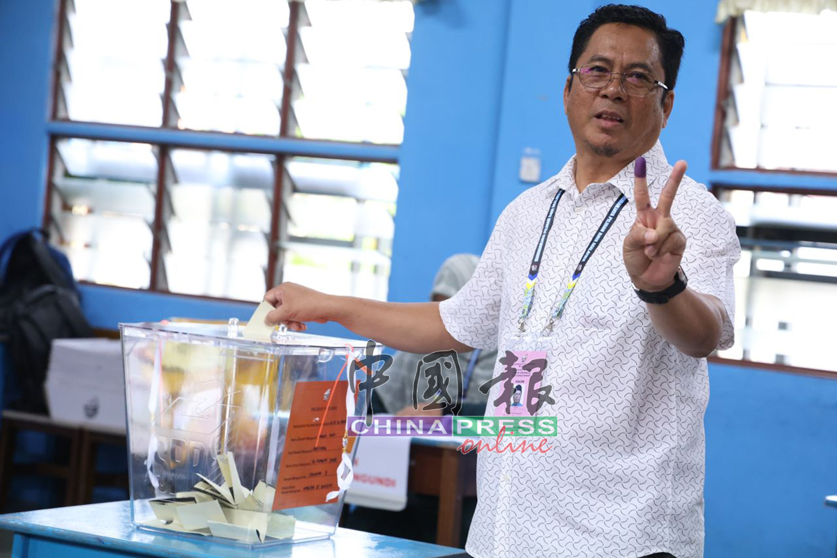 (威南6日讯)国盟双溪峇甲州席补选候选人阿比丁,于今早8时20分,在双溪努里国小投票中心,投下神圣的一票!