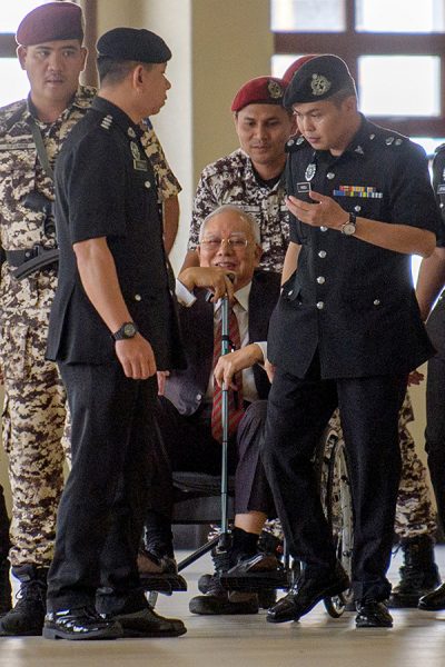 (吉隆坡25日讯)前首相拿督斯里纳吉今日坐轮椅出庭,并在庭内拄拐杖走到证人栏内供证;他供称,在担任财政部长时,他没以事无大小都要插手的方式,管理任何隶属财长机构的政联公司,当中包括SRC国际私人有限公司。