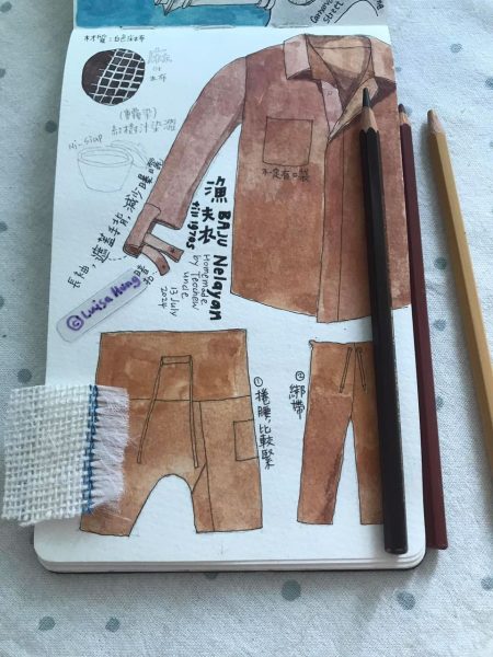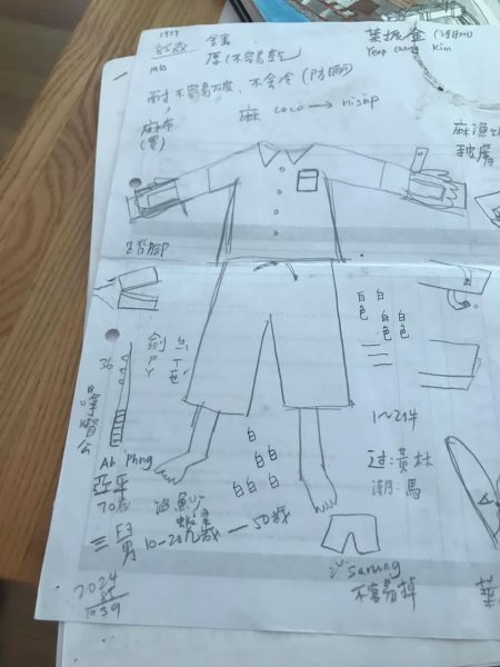 7月至9月,洪菀璐走访十八丁,与渔夫、裁缝师及村内大小村民多次交流,细节修改、制作版型、寻找布料、剪裁和车缝。她觉得特别有趣的是,七十多岁的村民安哥对水衣水裤的细节如袖子和口袋等记忆犹新,而八十多岁的阿嬷甚至能亲手画出版型。