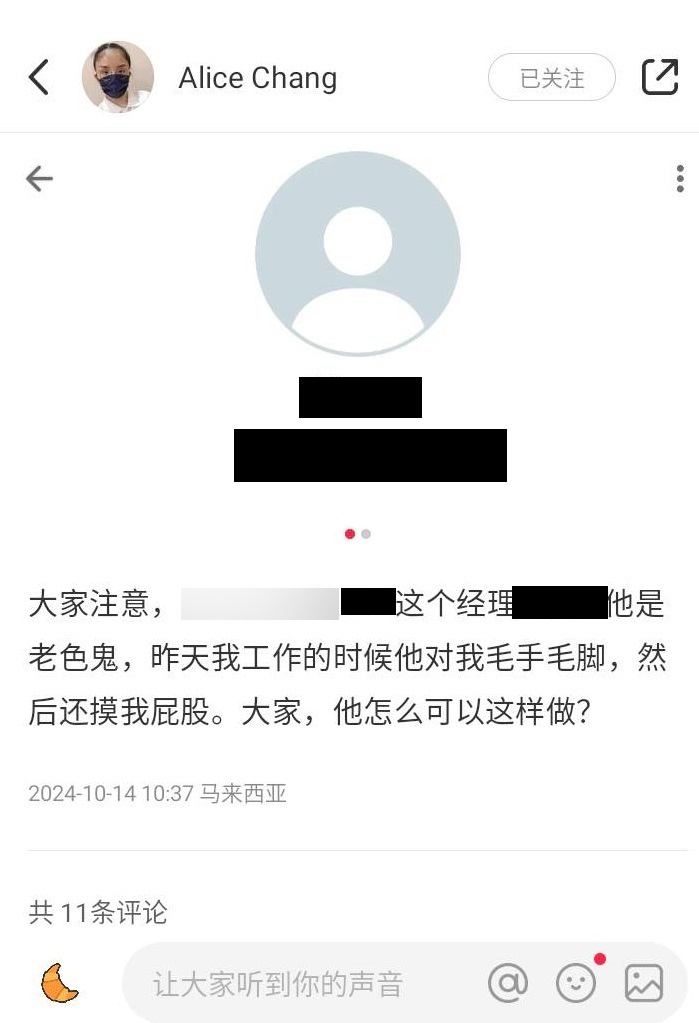 Alice Chang今日透过小红书及面子书发布帖文,指控该快餐店经理是名老色鬼,并指对方昨天在工作时对她毛手毛脚,然后还抚摸她的屁股。