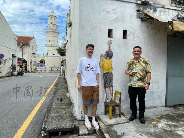 恩纳斯(左起)与黄汉伟,前来查看已完成修复的爬墙小孩壁画。