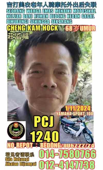 家属接受《中国报》访问时指出,失踪者是68岁的庄监福(Cheng Kam Hock),来自美农,已退休约有4年,平时很少出门,即时有也一般只是在半小时至1小时内就会回家。