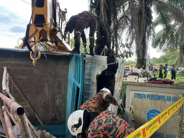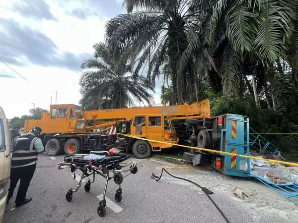 (双溪大年18日讯)吊车驶出路口时疑煞车器失灵,直接撞上罗厘,导致罗厘翻覆,一名华裔男子受困车内,等待消拯员救出。