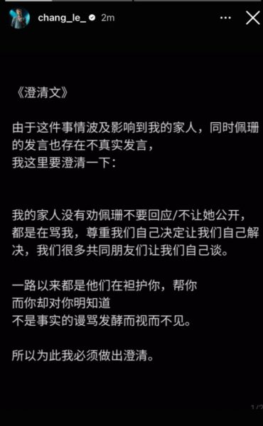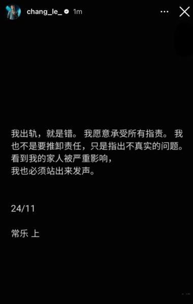 常乐在文中提到前女友佩珊不真实发言,并强调他的家人没有阻止她公开发言,却一而再让网友误会他的家人对她百般阻扰,因此常乐承认他有错在先,愿意承受所有指责。“我不是要推卸责任,只是看到我的家人被严重影响,我必须站出来发声。”