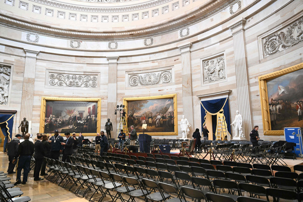 (华盛顿19日综合电)美国候任总统特朗普20日就职典礼临时改至国会山庄圆形大厅举行。工作人员加紧布置,大厅已排出折叠椅,美媒报导约可排600张椅子,目前一位难求,特朗普的金主也难拿到入场券,急电特朗普阵营帮忙。