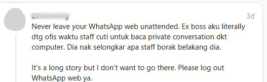 “我的前老板就是趁假日期间来到办公室,打开大家的电脑,翻阅我们的WhatsApp对话,想看看大家在背后说他什么。