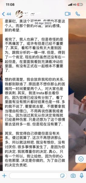 此外,根据她上传的其中一则截图内容显示,女子跟V“摊牌”后,对方发长文给她,字字句句透露着非常无奈且失落的感觉,并在文中表达自己不会因此恨女子,并尊重女子的决定,称“自己傻过就算了,所以就这样吧”。