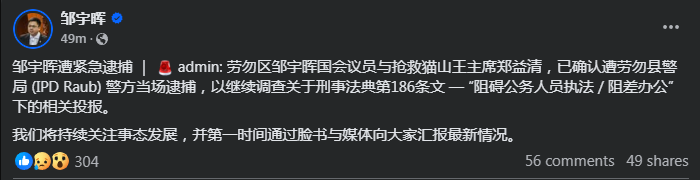 行动党劳勿区国会议员邹宇晖,与抢救猫山王联盟主席郑益清,今午依时到劳勿警察总部针对阻碍执法人员在劳勿非法芭执法一案,录口供助查,岂料随后传出将被警方逮捕的消息。