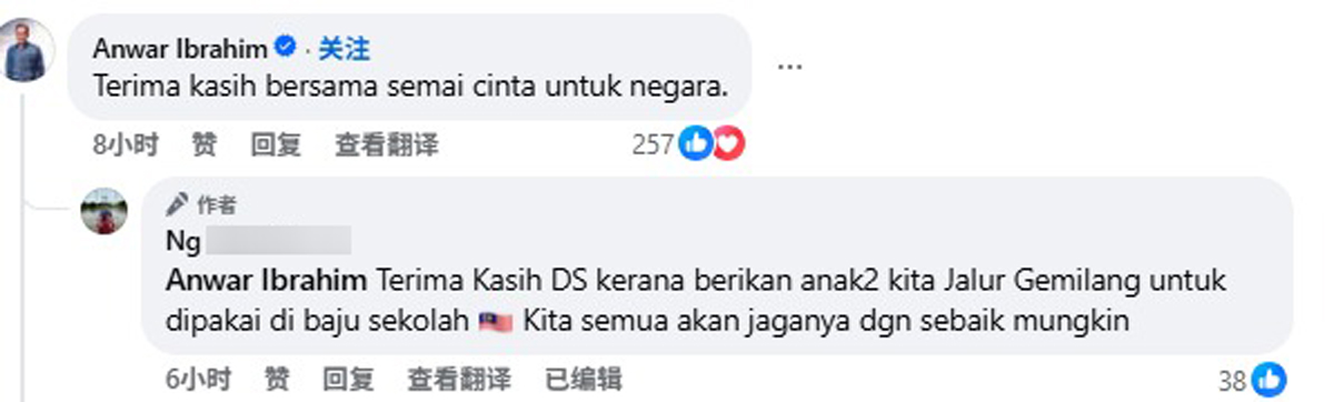吴志坚则在评论区回复:“感谢拿督斯里赠予孩子们佩戴在校服上的国旗扣章,我们会好好珍惜。”
