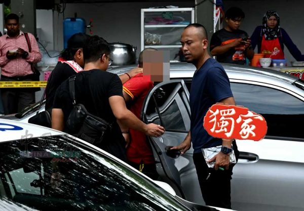 身穿红色上衣的嫌凶当场被捕后,双手被套上手拷,在现场接受警方的调查,重述案发过程。