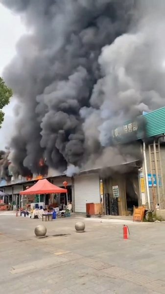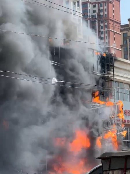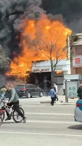 事发于周二中午12时许,地点为辽阳市三里庄附近一家饭店,明火从二楼窗口猛烈窜出,火势迅速蔓延,现场浓烟遮天蔽日。