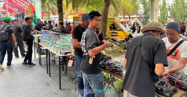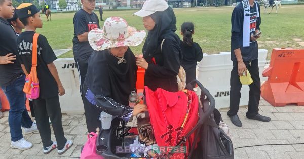 11.55AM 伊党志工团(Jabatan Amal)安排逾200名志工在十合广场集合点维持秩序。