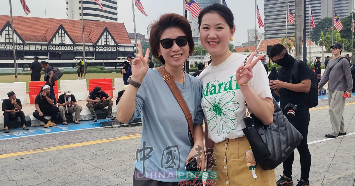 12.19PM 2名来自中国的女游客“误闯“倒安华大集会”,获悉是反首相集会后,仍旧在场拍照留念。