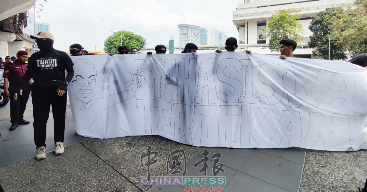 参与“倒安华”集会的大专生,手绘巨型横幅,横幅画有安华卡通及“大专生被压迫(MAHASISWA TERTEKAN)”字眼。