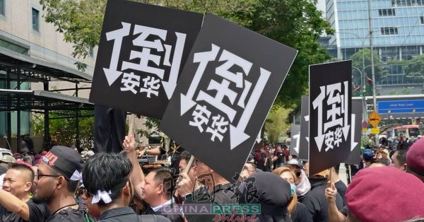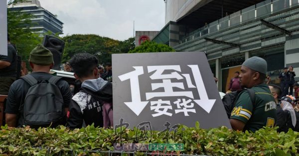 民政党党员集会者,手持黑底白字的“倒安华”中文标语及制服到场。