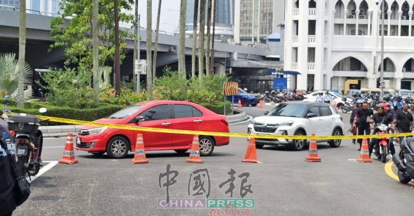 1:40PM 警方在国家清真寺前交通圈设置路障,限制车流,以确保集会者稍后能安全步行至独立广场。