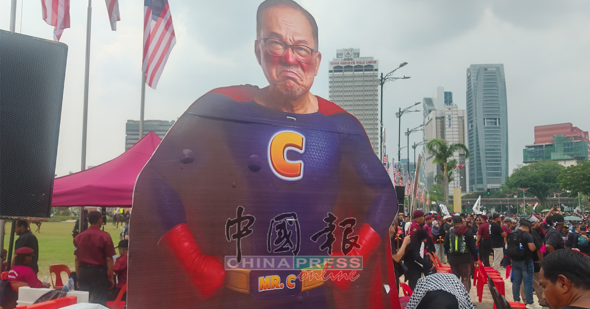 1:53 PM 现场集会者高举首相拿督斯里安华超人形象的立牌,有关立牌腰带印着”MR C”字眼,C意指为税务(Cukai),调侃安华是”税务超人”。