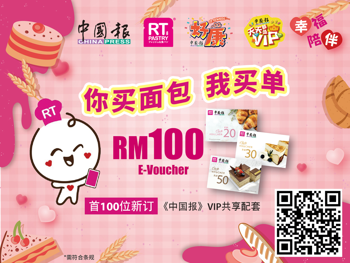 新订《中国报》VIP共享配套的前100位用户,将可获得总值100令吉的RT Pastry电子现金礼券组合。