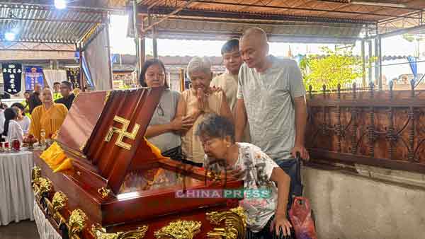 钟善恩灵柩旁,其泰籍母亲悲恸不已,依依不舍的叮咛女儿,情绪一度崩溃痛哭,需亲人搀扶。