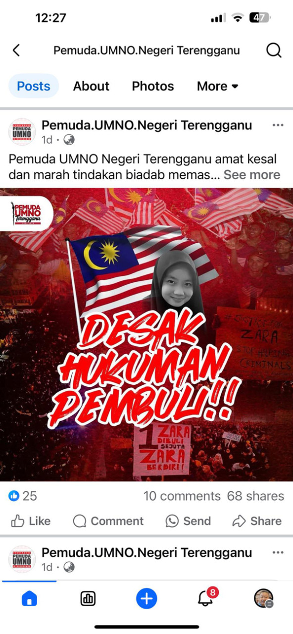登州巫青团昨早配合一则贴文上载的上述照片背景,除了有国旗,也有13岁已故巫裔少女扎拉凯丽娜的照片,配上“要求惩处霸凌者”的红色字体,呼吁政府在扎拉凯丽娜的疑因遭霸凌,而在沙巴一所宗教学校宿舍坠楼身亡案中,对付施暴者。