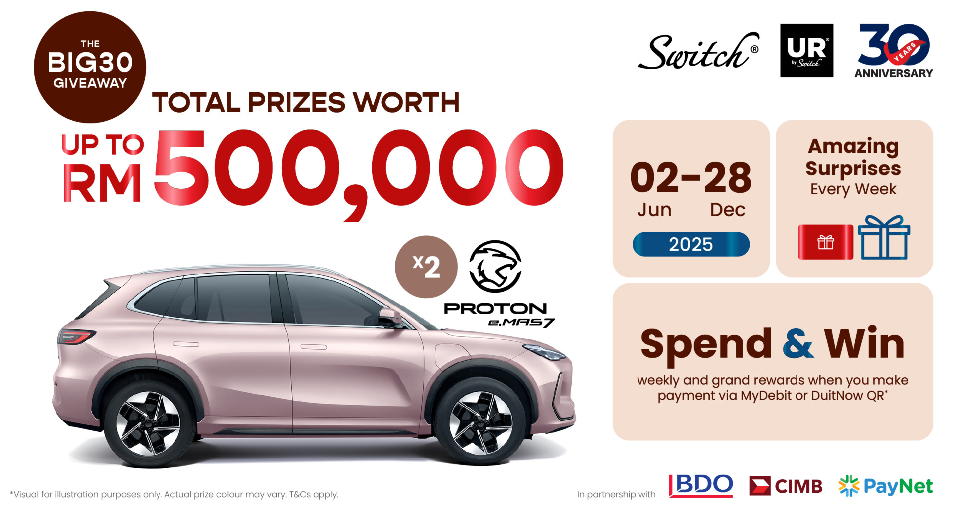 活动期间,顾客凡在全国任何一家Switch或Urban Republic门店(含线上商店)使用MyDebit或DuitNow QR付款,即可自动获得抽奖资格,竞逐总值高达50万令吉的每周奖品,而终极大奖则为全电动Proton e.MAS 7。此活动由联昌集团控股有限公司(CIMB)与大马支付网络有限公司(PayNet)携手推动,为赠奖活动注入更高价值与更广影响力。