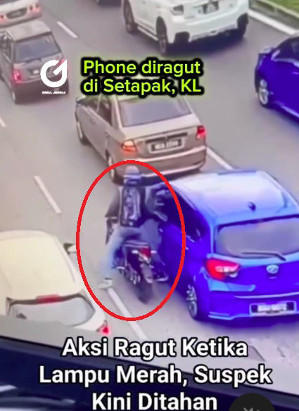(吉隆坡23日讯)女子坐在轿车副驾驶座时,打开车窗吹着微风玩手机,结果摩哆掠夺匪趁机干案,1秒伸手抢走女子手机后,绝尘而去!