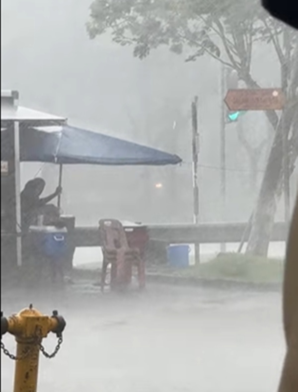 视频也拍到路边摊贩,拉着大雨伞在与暴雨狂风抗衡一幕。