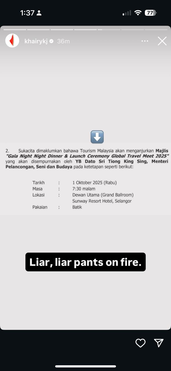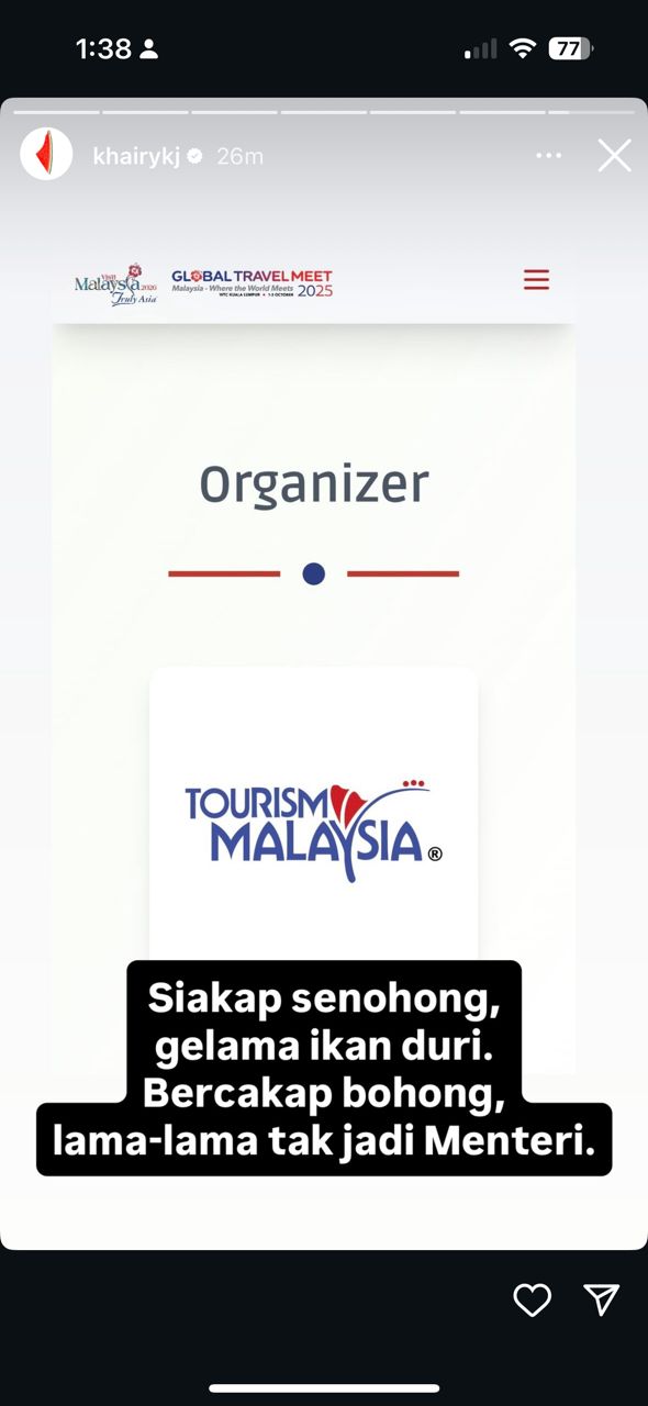 凯里上传一张显示大马旅游局为活动主办方的截图,讽刺张庆信“说谎话久了,迟早当不成部长。”