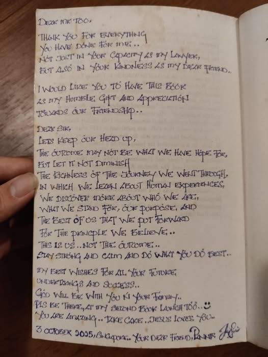 朱兴基周四(9日)在个人面子书账号发文悼念潘尼尔,并公开他的手写信,行文满载感恩、信仰与坚韧;潘尼尔鼓励朱兴基,即便未能成功阻止执行与获得赦免,依旧要昂首前行,继续做自己擅长的事。