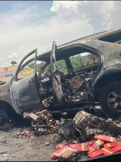 其中一辆休旅车与一辆轿车在士乃—迪沙鲁大道相撞后起火燃烧。