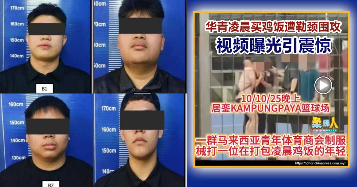 (居銮12日讯) 华青凌晨买鸡饭遭围攻,4名涉案男子被警方逮捕。