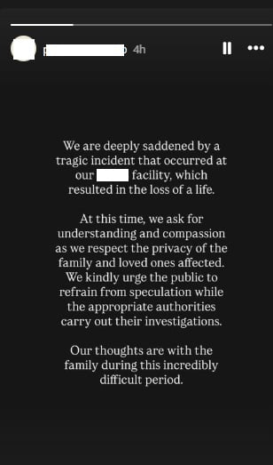 另一方面,涉事场负责人今日在Instagram发布限时动态,指对于这宗导致一人丧命的悲剧事件,深感悲痛。