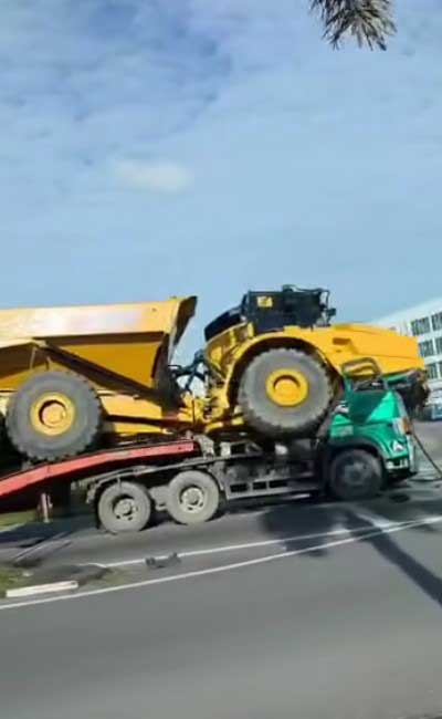 (美里4日讯)拖格罗厘在运载一辆矿用自卸卡车时,疑在红绿灯路口紧急煞车,导致自卸卡车滑向前方砸中罗厘车头,司机和跟车员被当场砸死!