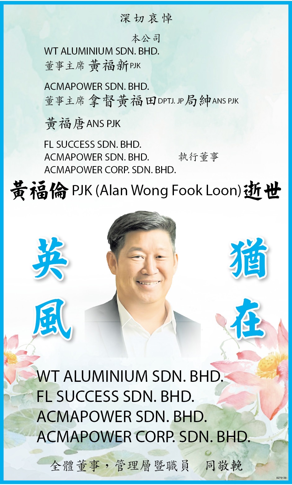 深切哀悼 FL SUCCESS SDN BHD, ACMAPOWER SDN BHD, ACMAPOWER CORP. SDN BHD 执行董事 黃福倫PJK ( ALAN WONG FOOK LOON)往生 董事部 、管理层暨全体职员 同敬輓